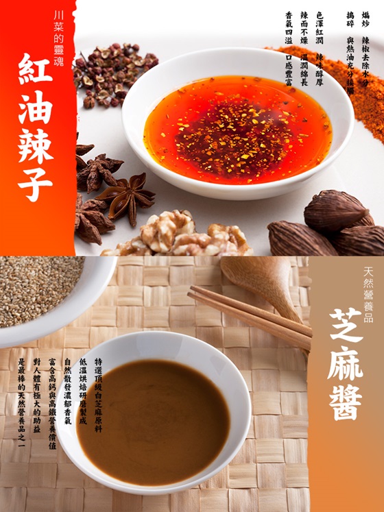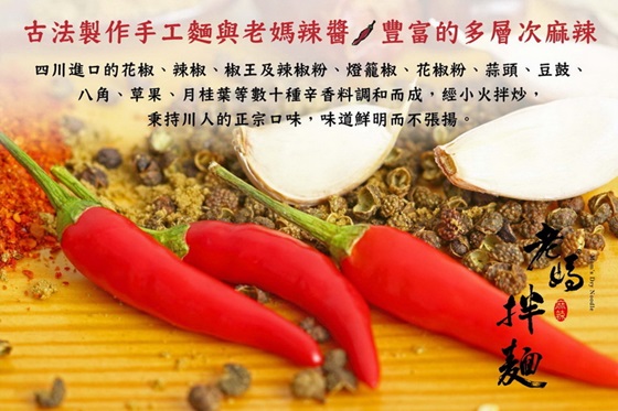 選用四川進口花椒、辣椒、八角、月桂葉等數十種辛香料,小火拌炒精練調配,秉持著家中老媽挑剔的個性,調教出最香辣帶勁的四川正宗辣醬,搭配上厚實Q彈的關廟麵條,將挑剔的味蕾即刻征服