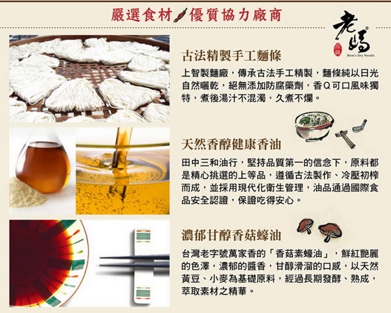 團購界赫赫有名的老媽拌麵,識貨之人必吃美食!特別注重食材的挑選,謹獻給你如同媽媽手做的幸福味,以台南日曬關廟麵為主軸,加上其獨門特調醬料,濃郁甘醇,口感豐富!每一口都是令人懷念的好滋味!