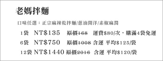 商品訊息簡述: 平均每袋最低只要120元起(4袋免運)即可購得老媽拌麵1袋/6袋/12袋:正宗麻辣乾拌麵/蔥油開洋/素椒麻醬。